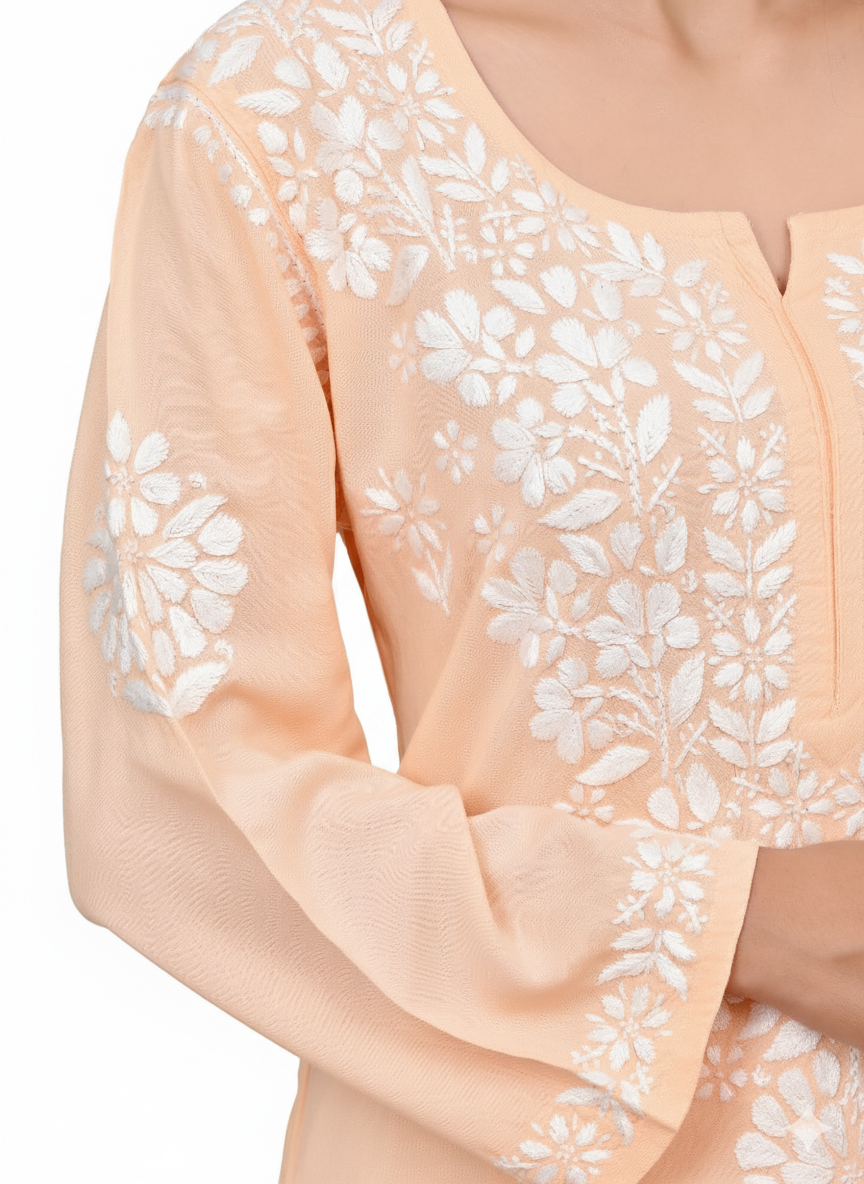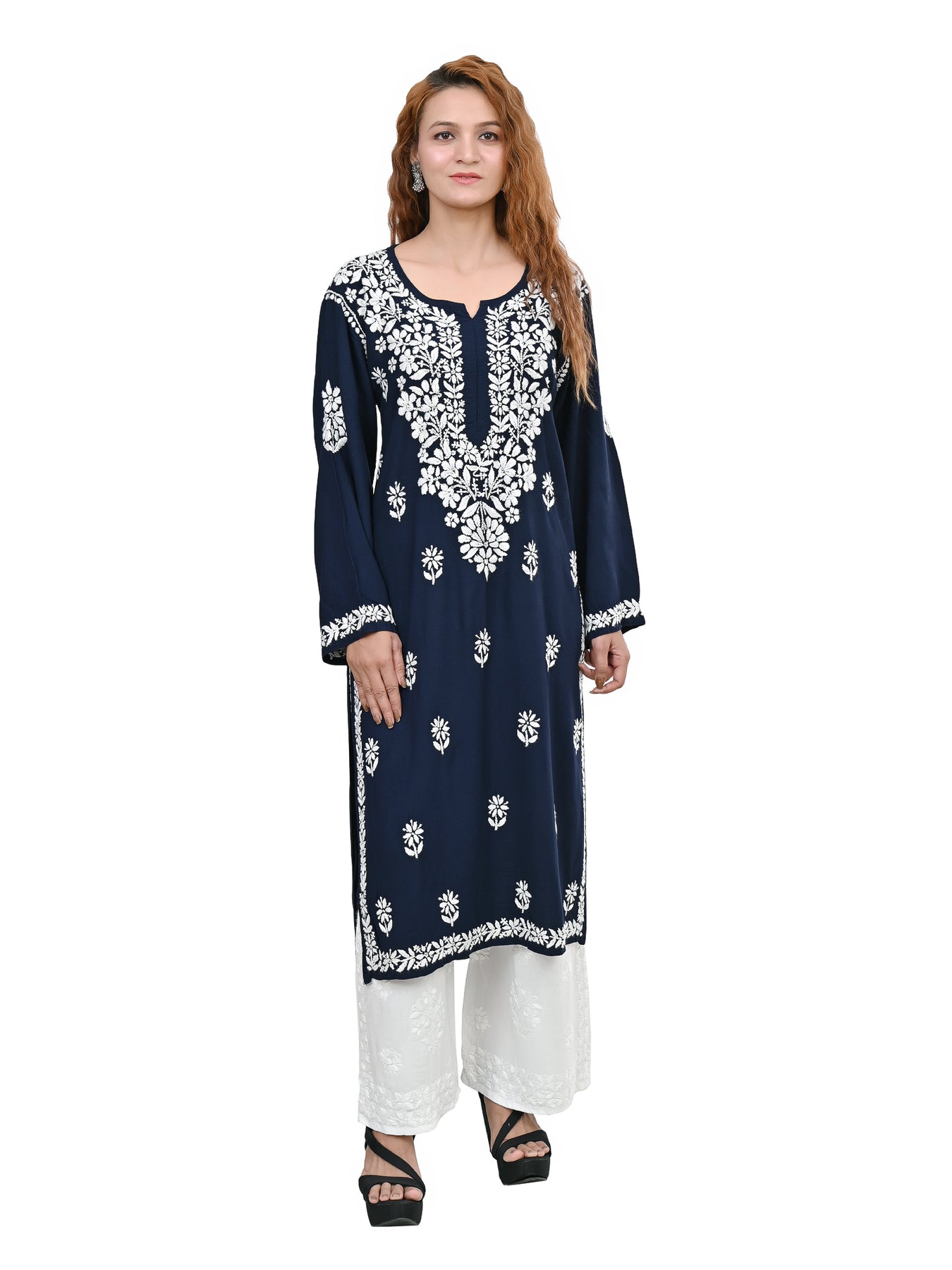 MS CHIKAN ARTS Women's Rayon Full Sleeve Lucknowi Chikankari Hand Work Round Neck Kurti
